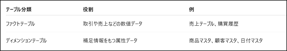 Power BIで推奨される構造が、**星型スキーマ(Star Schema)**です。