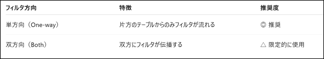 リレーションには「単方向」と「双方向フィルタ」があります。