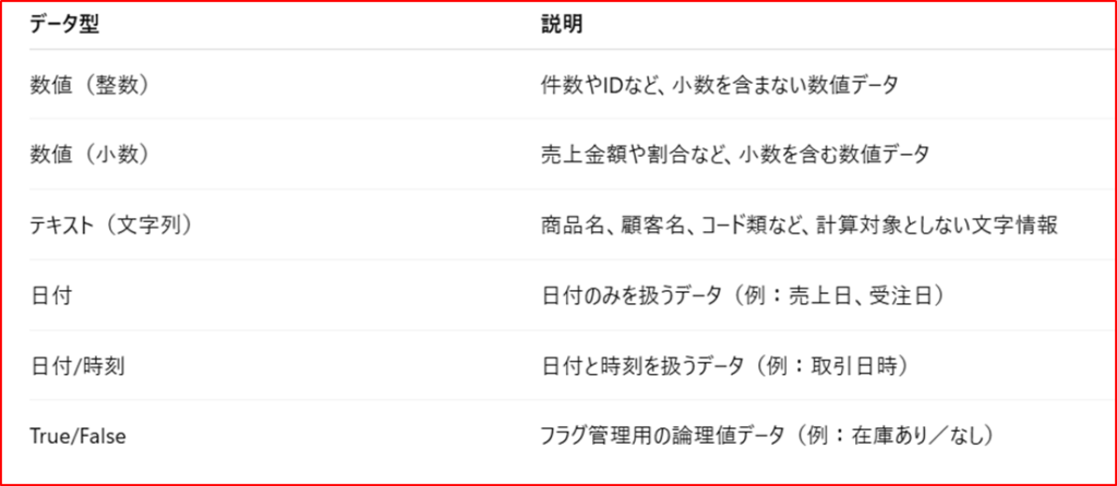 - 数値型:集計(合計・平均)やKPI計算に使う
