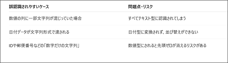 → たとえば「データ削除→型変換」と「型変換→データ削除」では結果が変わることもあります。型の設定はできるだけ後半でまとめて行うのがおすすめです。 - 自動型認識は完璧ではない