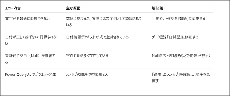 本記事では、Power BIにおけるデータ型の基本から、設定・変更方法、よくある変換エラーとその対処法、さらに適切なデータ型設定がもたらす実務上のメリットまでを整理して解説しました。