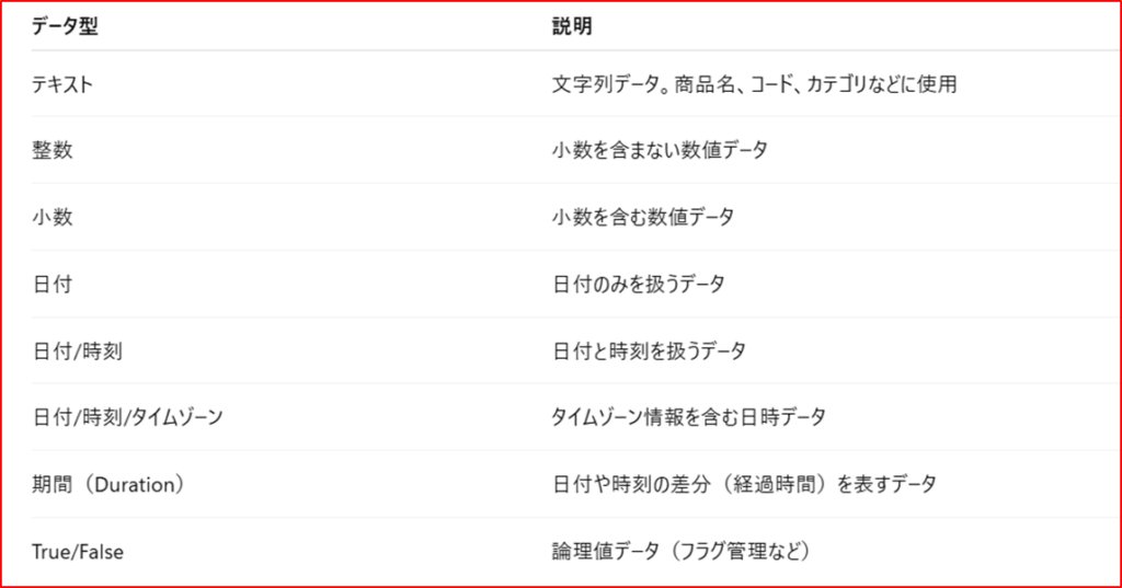 データ型を正しく設定しておくことで、レポート作成や運用の安定性が大きく向上します。