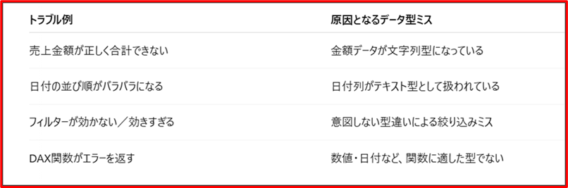 Power BIにおいて、データ型の設定ミスはレポート作成や分析結果に大きな影響を及ぼします。具体的には、以下のようなトラブルが発生するリスクがあります。