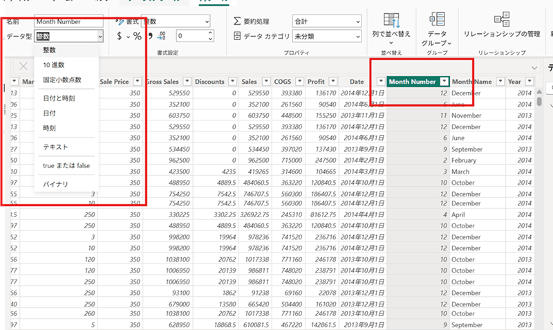 - 型を途中で変えると、既存のビジュアルやDAX式に影響を及ぼす場合があるので、慎重に変更してください!