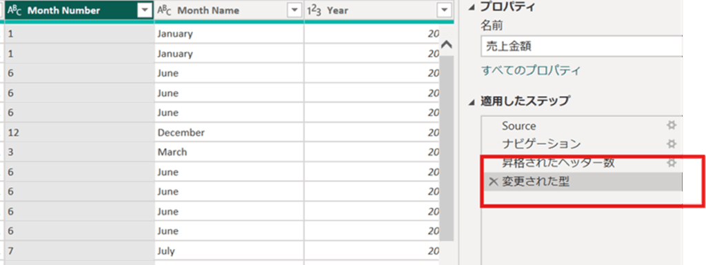 画面右側の「適用したステップ」に「型の変更」が追加されていることを確認します。