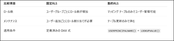 行レベルセキュリティの方式は、大きく「固定 RLS(ロールベース)」と「動的 RLS(マッピング テーブル+DAX)」の二択です。