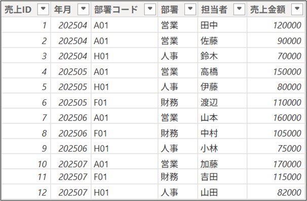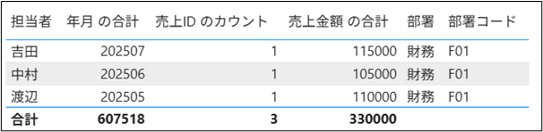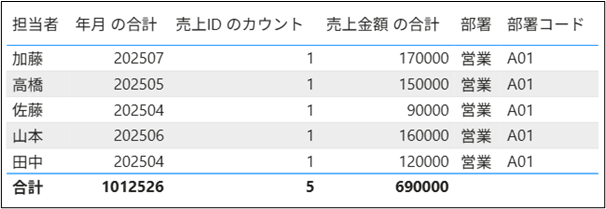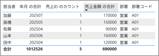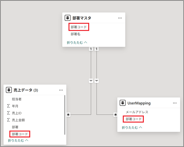 売上テーブルとUserMappingテーブルを部署マスタテーブルの「部署コード」で接続します。(部署マスタを設定することで、1対多で適切にリレーション設定が可能です。)