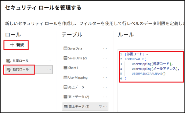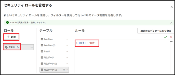 再度 [ロールの管理] を開き、新しいロールを作成。売上テーブルに対し、以下を設定します。