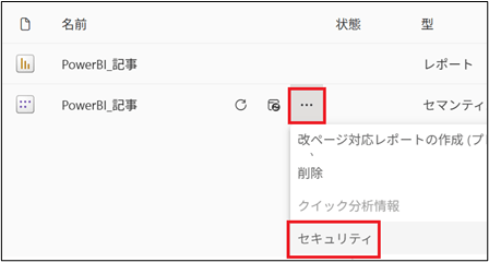 レポートを発行後、Power BI Service側でデータセット → […] → [セキュリティ]からロールにユーザーを追加します。