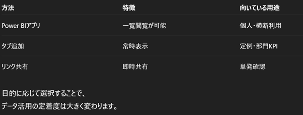 TeamsとPower BIの連携方法は複数あり、用途に応じた使い分けが重要です。