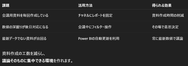 Teams×Power BI連携は、さまざまな業務シーンで効果を発揮します。