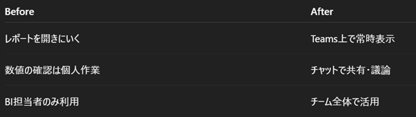 Teams上で常に見える状態にすることで、KPIが「意識するもの」から自然に目に入るものへ変わります。