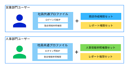 従来は、部門や役割ごとに別のプロファイルを作成する運用もよく行われていました。しかし、プロファイルは1ユーザーにつき1つしか割り当てられないため、細分化すると数が増えすぎ、管理が複雑化してしまいます。
