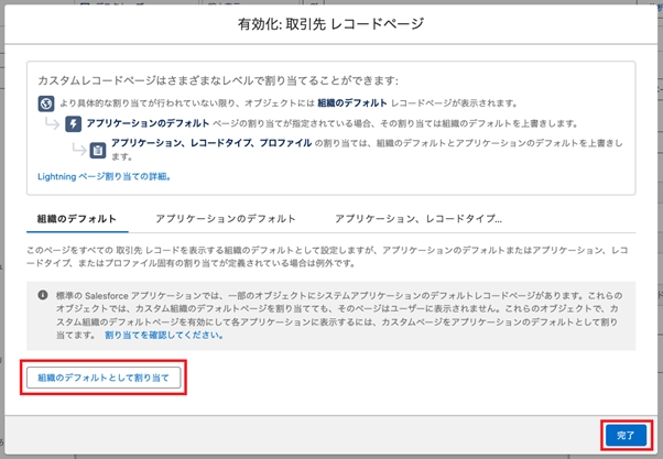 ※Lightningページはアプリケーションやレコードタイプ、プロファイルごとに割り当てることも可能です。その場合は、[アプリケーションのデフォルト]タブ、[アプリケーション、レコードタイプ、プロファイル]タブで設定します。