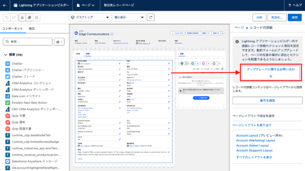 - レコードの詳細コンポーネントを選択した状態で、[アップグレードに関するお問い合わせ]をクリック