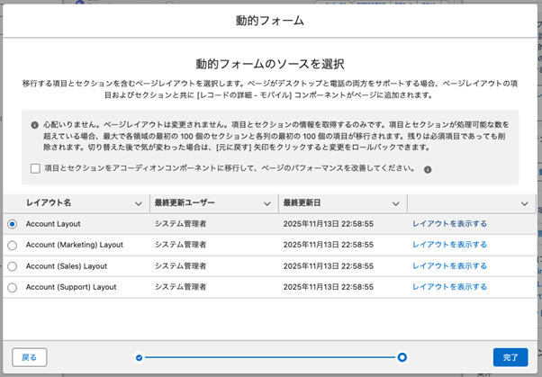 - 動的フォームのもとになるページレイアウトを選択して、[完了]をクリック