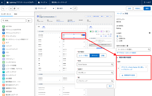 Lightningページでは、コンポーネントの表示条件を設定することで、モバイルでは不要なコンポーネントを非表示にし、PCでは引き続き表示するといった使い分けが可能です。