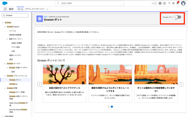 有効化は[設定]→「Einstein Bots」でトグルONから開始できます。