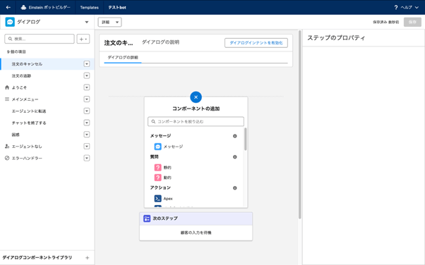 作成したボットをEinsteinボットビルダーで開くと、編集画面が表示されます。