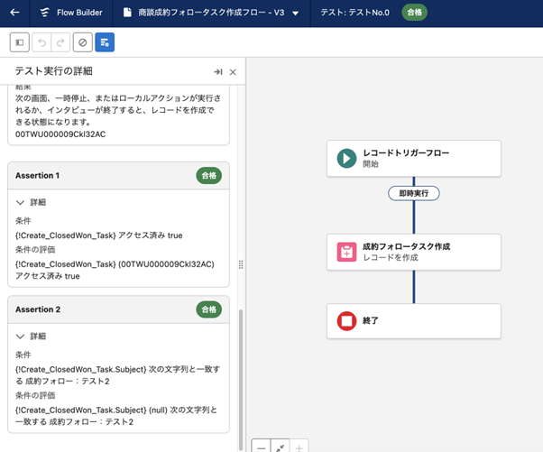 このように、フローでのテストではあくまで流れがうまく動くかということに焦点を当てます。Apexクラスの中身でちゃんと処理が行われているかはApex側のテストで検証しましょう。
