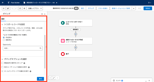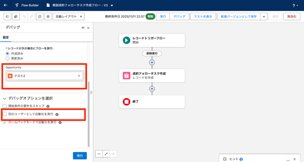 フェーズが成約の商談「テスト2」を入力してデバッグを実施します。また「別のユーザとして自動化を実行」にチェックし、別のユーザとしてフローをデバッグすることもできます。