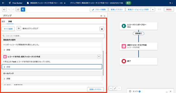 | 検証対象 | 個々の処理手順、変数、条件分岐の結果などフロー内部の動作。 | 入力条件・例外パターンを含めた全体的なビジネスロジックの整合性。Apexとの干渉も確認。 |