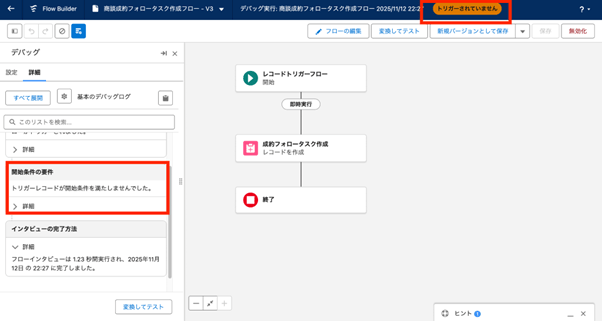 使用したレコードがフローの開始条件を満たしておらず、右上には「トリガーされていません」と表示されています。このように、作成したフローが期待通りに稼働するのかを部分的な条件を設定して、デバッグを実施していきます。