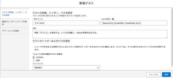 今回は、商談のフェーズが成約になった際に、ToDoを新規作成するフローを使用していきます。