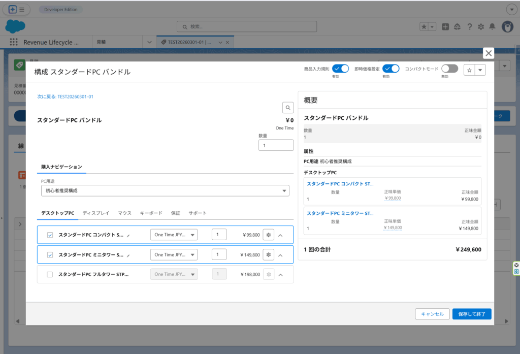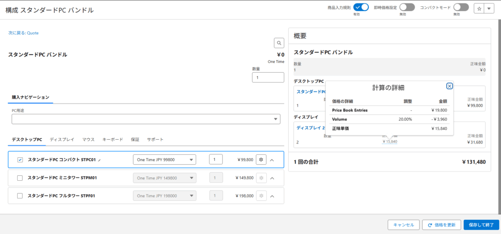 - 推奨提案:特定構成時に追加を推奨する商品を表示