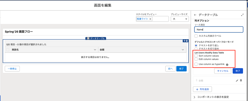 画面フロー:データテーブルコンポーネントで列操作が可能に
