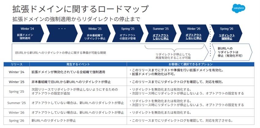 Summer’25(2025年6月リリース)では、その次回メジャーアップデートであるWinter’26(2026年10月リリース)時にリダイレクトが自動的に無効化されないようにするための設定が可能でした。(=オプトアウト)。