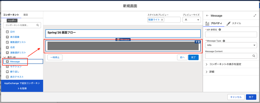 表示テキストコンポーネントなどが並んでいる「表示」セクションにMessageコンポーネントが追加されています。