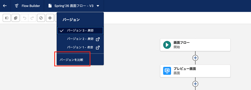 今回のSpring’26では画面フローでもフローバージョン比較が可能になりました。