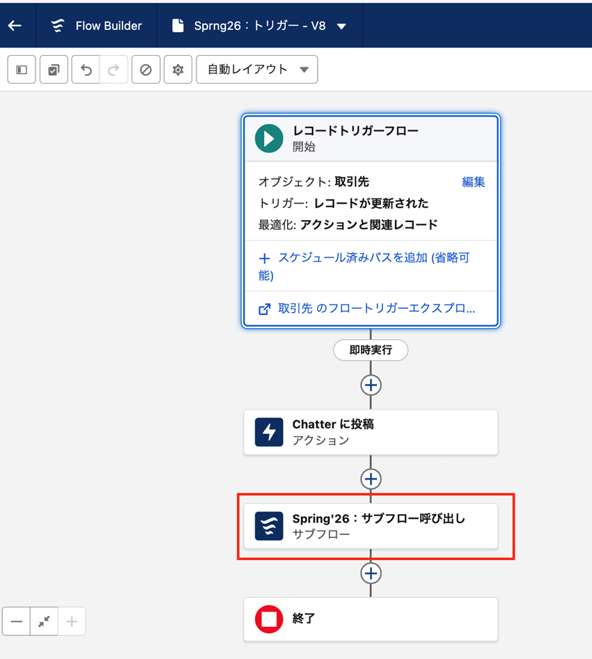 ・レコードトリガーフローで自動起動フロー「Spring’26:サブフロー」を呼び出す