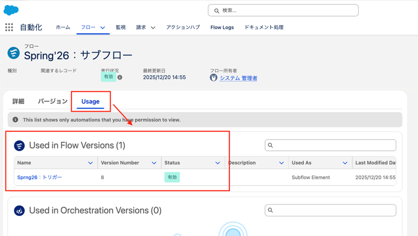 自動化アプリケーションの「Usage(使用状況)」タブで、どのフローバージョンがどのフローから呼び出されるかの確認が簡単になりました。