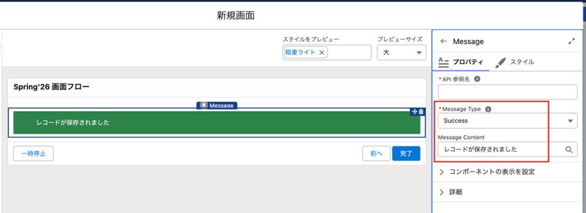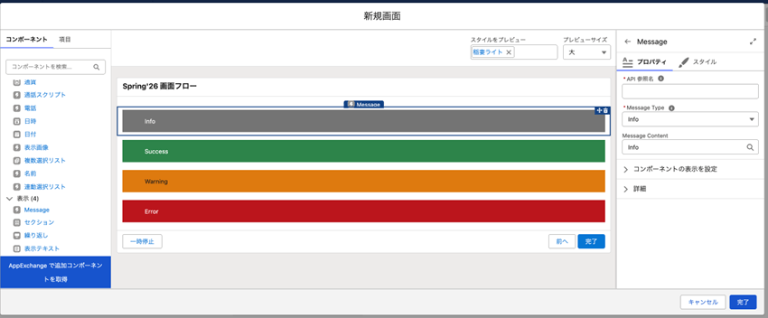 Salesforceでの各操作時ポップアップで表示されている、いわゆるトースト表示のデザインが画面フローでも使用できるようになります。