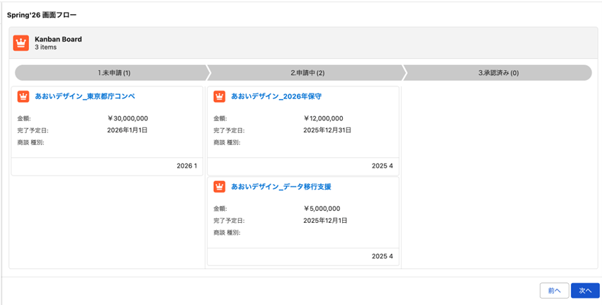 リストビューでは従来からカンバンビューが使用可能でしたが、類似のUIが画面フローで使用可能になりました。