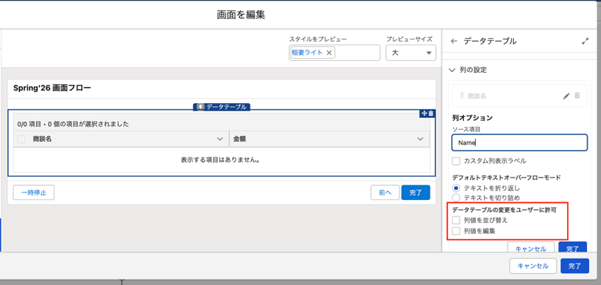 - 今回のSpring’26で追加された新機能「データテーブルの変更をユーザに許可」で