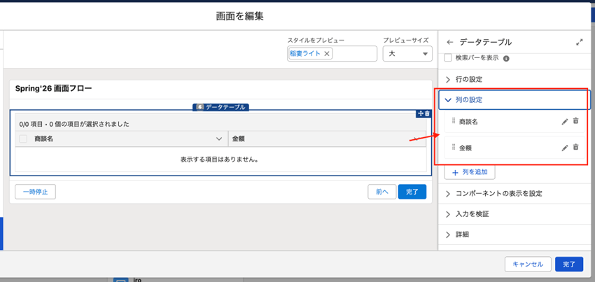 - データテーブルには商談の「商談名」「金額」項目を配置します