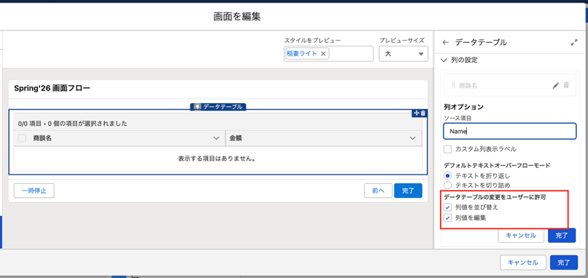 - 画面フローのデータテーブルコンポーネントの「列の設定」で“データテーブルの変更をユーザに許可”セクションが新たに設けられました
