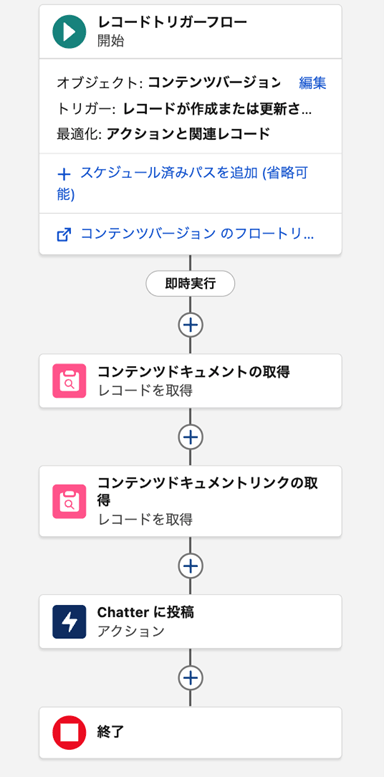 コンテンツバージョンをトリガーにしてファイル添付先の取引先へChatter投稿するレコードトリガーフローを作成します。