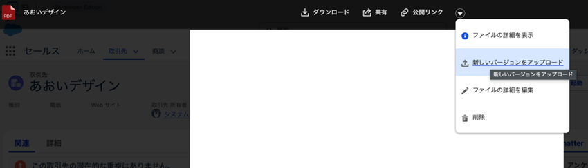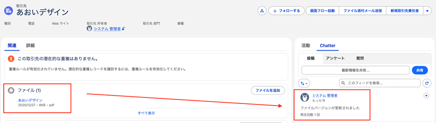 取引先へPDFファイルを添付すると、下記のようにChatter投稿できることを確認できました。