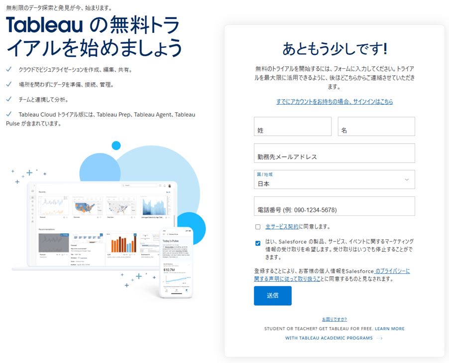 まずは無料で始めたい方向けに、Tableau Publicのアカウント作成手順をご紹介します。数分もあれば完了するので、気軽に試してみてください。