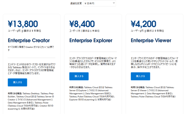 Explorerは、Tableau CloudまたはTableau Server上でデータ分析を行うユーザー向けのライセンスです。